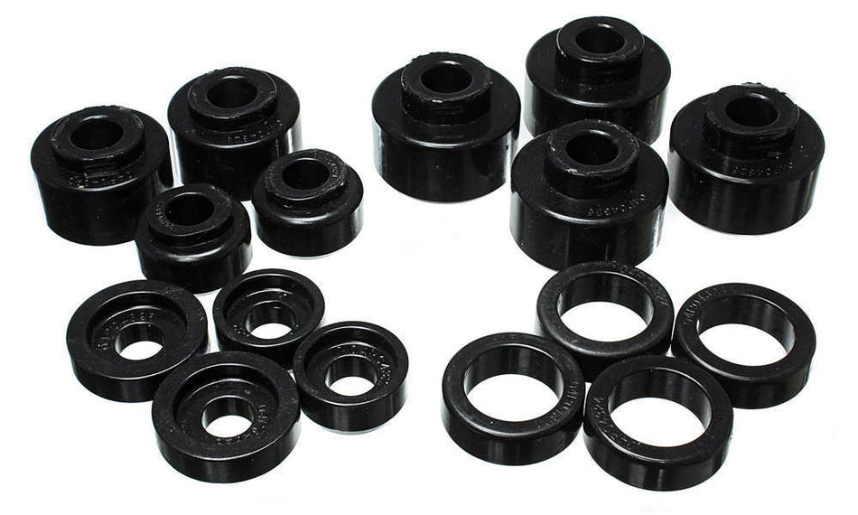 Body Mount Bushings are made of rugged polyurethane material and replace distorted and worn-out original rubber mounts to maintain car body alignment. Polyurethane body mounts are rugged enough for the most demanding track. Most sets have a strong zinc plated steel ring molded into them for added durability and when the application requires it.