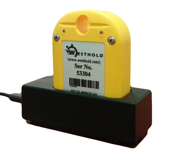 Westhold Transponders are quickly charged with the convenient charging cradle. Max charge time is ~ 3 hours. Typical charge time is ~ 1 hour. LED lights on the transponder indicate full charge while in the charging cradle. When removed from the cradle the transponder green LED indicates approximate number of days of life left (up to 7 days). A red LED indicates when the transponder charge has less than 1 day remaining.