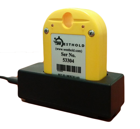 Westhold Transponders are quickly charged with the convenient charging cradle. Max charge time is ~ 3 hours. Typical charge time is ~ 1 hour. LED lights on the transponder indicate full charge while in the charging cradle. When removed from the cradle the transponder green LED indicates approximate number of days of life left (up to 7 days). A red LED indicates when the transponder charge has less than 1 day remaining.